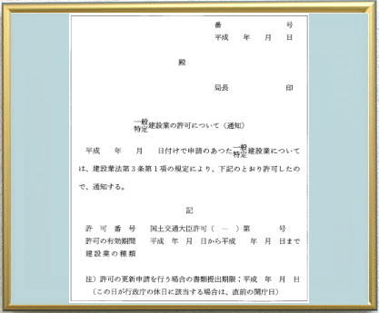 | 新提案 建設業許可通知書や各種営業許可証を額に入れて。。 店舗や事務所の信用に。。各種認可票に並べて飾ってみてはいかがですか? |